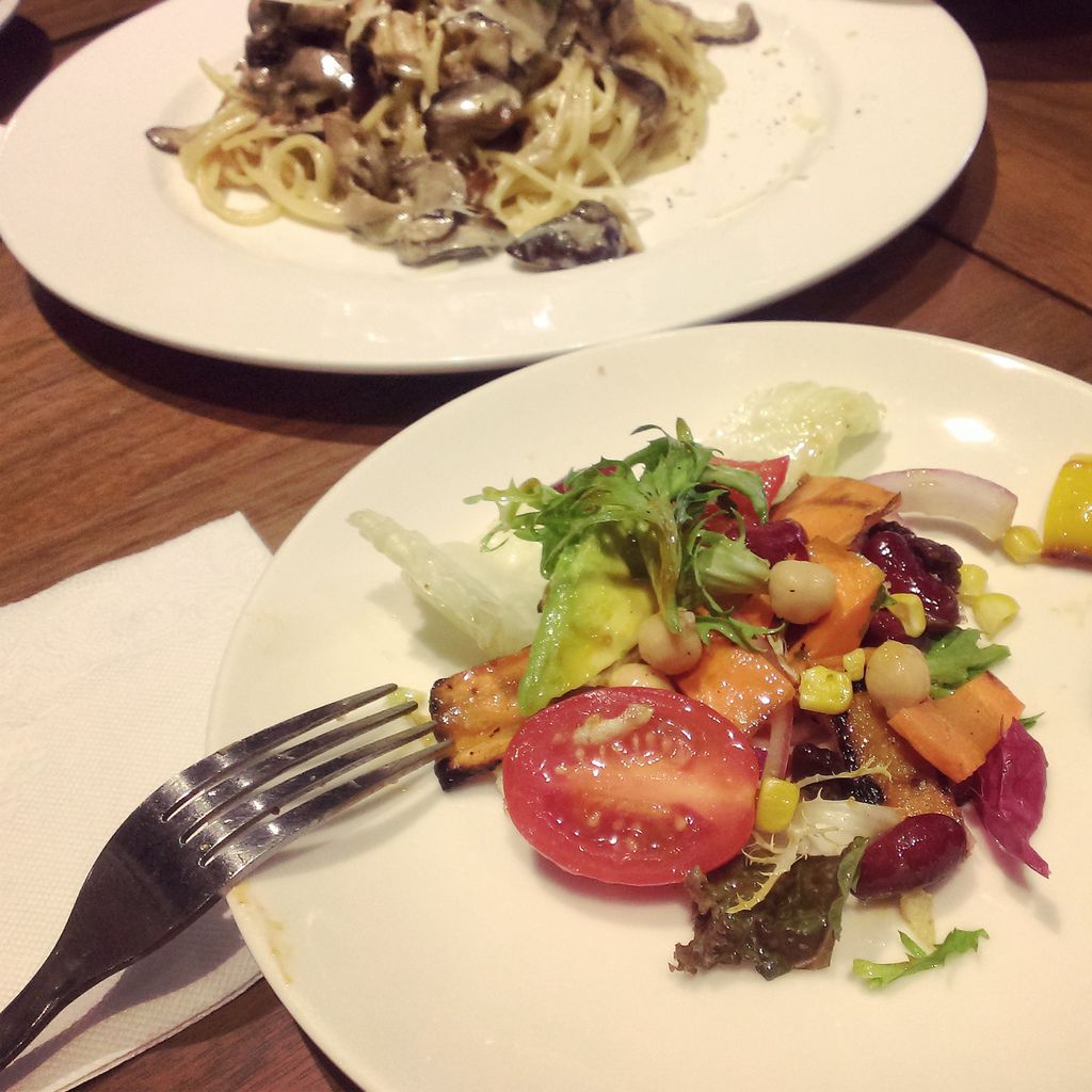 我們那天是四個人去吃,單點了沙拉、義大利麵、薄餅、甜點各一份